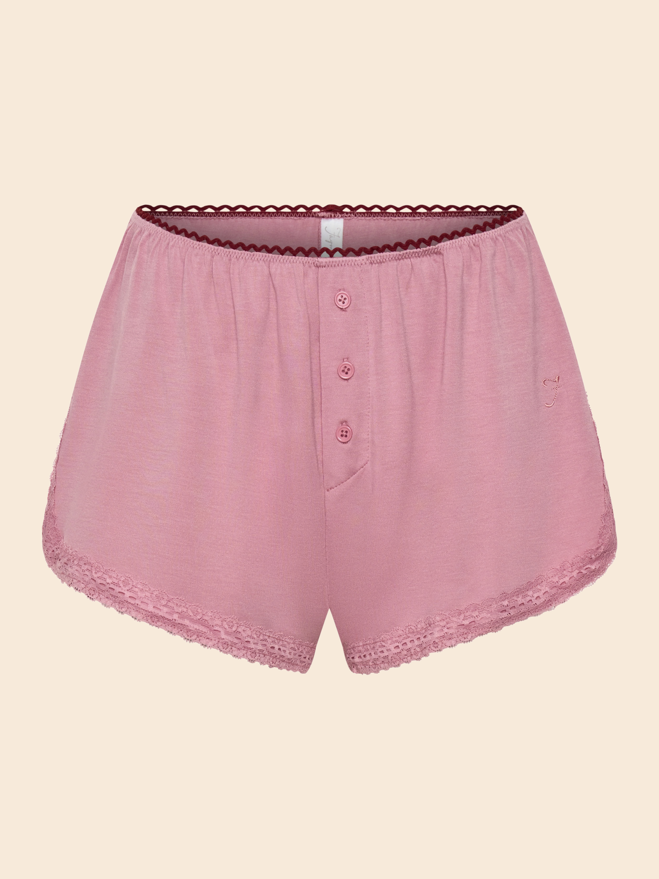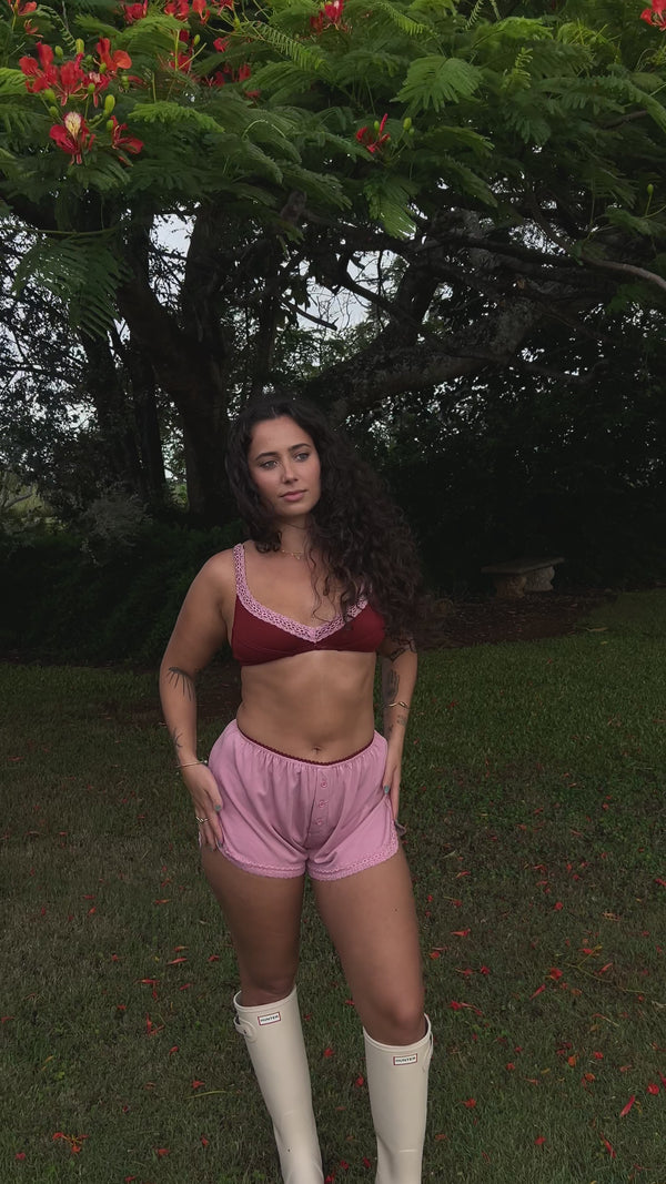 Designed for slow mornings, sweet dreams and those comfortable moments. Made from our buttery-soft organic ribbed bamboo fabric, she drapes beautifully with the comfiest fit. Finished with a petal-pink scalloped waistband, button-front details and delicate lace for that feminine touch you love. Effortlessly cute paired with the Cherry Tank.